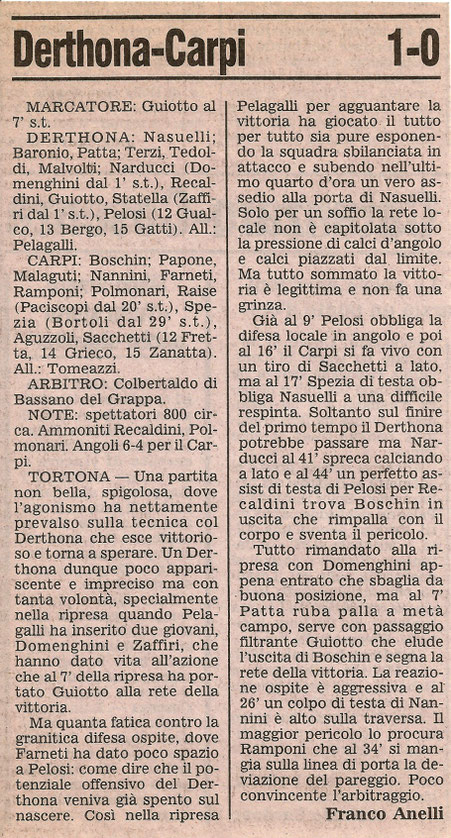 "Una partita non bella, spigolosa, dove l'agonismo ha nettamente prevalso sulla tecnica col Derthona che esce vittorioso e torna a sperare. Un Derthona dunque poco appariscente e impreciso ma con tanta volontà, specialmente nella ripresa [...] Ma quanta fatica contro la granitica difesa ospite [...] nella ripresa Pelagalli per agguantare la vittoria ha giocato il tutto per tutto sia pure esponendo la squadra sbilanciata in attacco [...] Ma tutto sommato la vittoria è legittima e non fa una grinza."