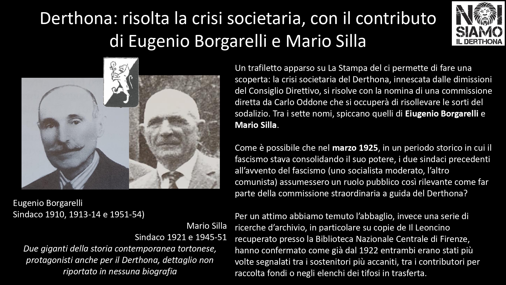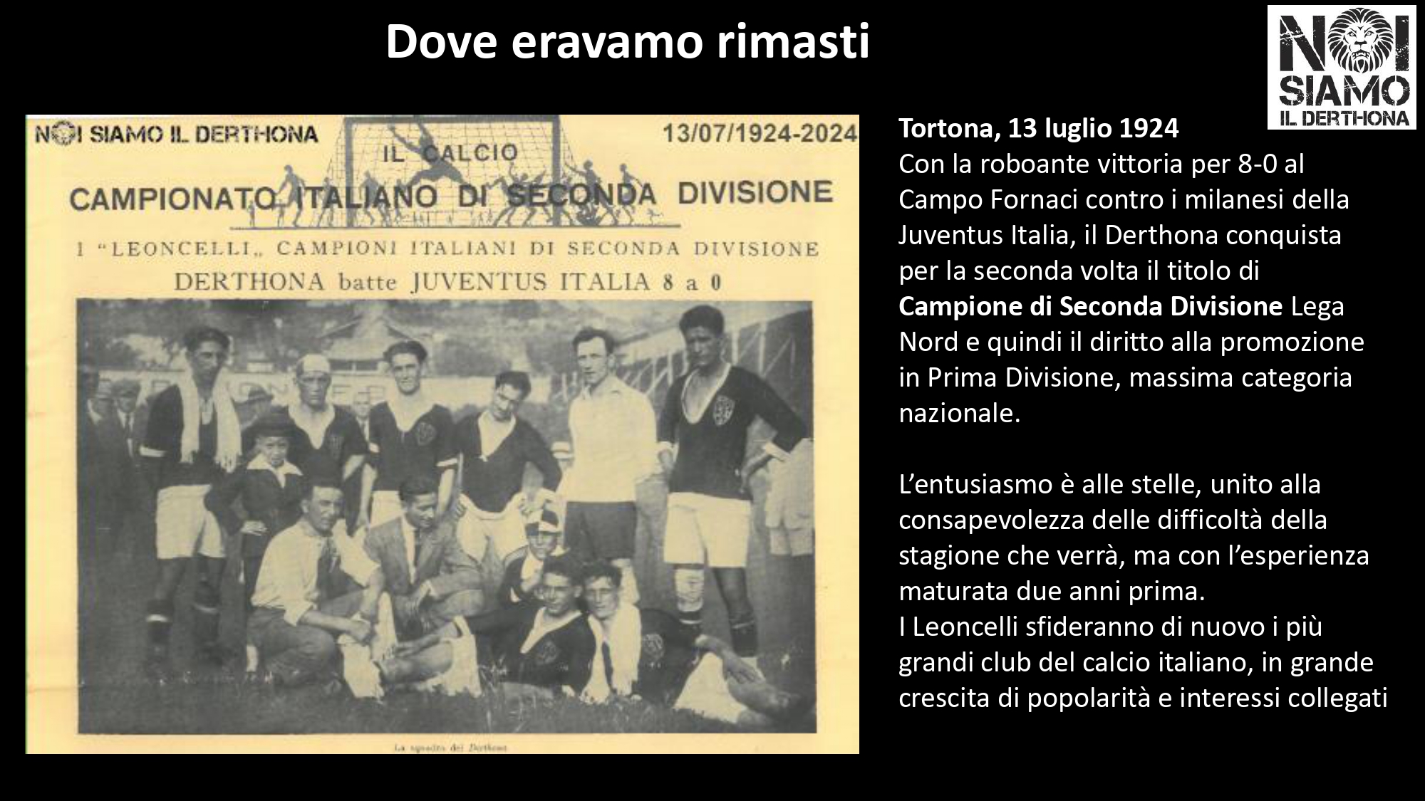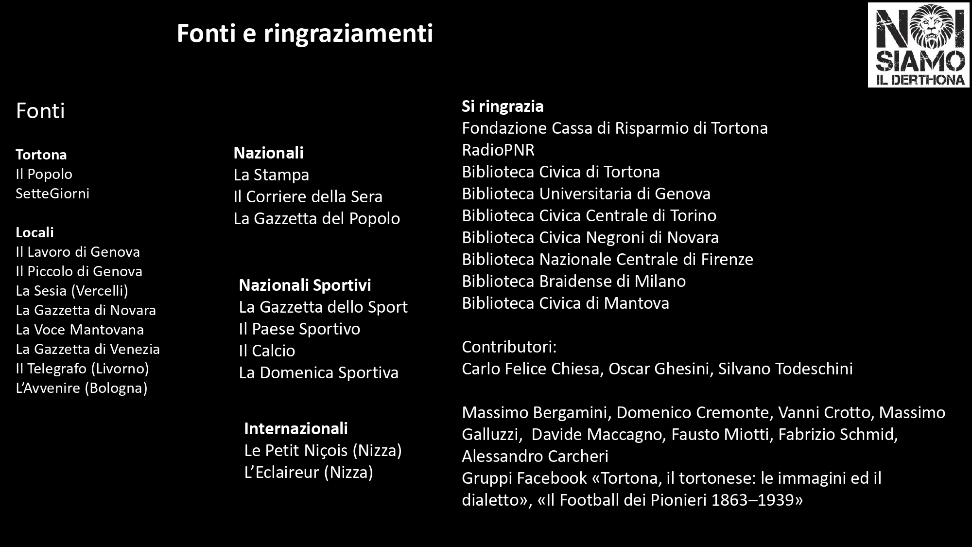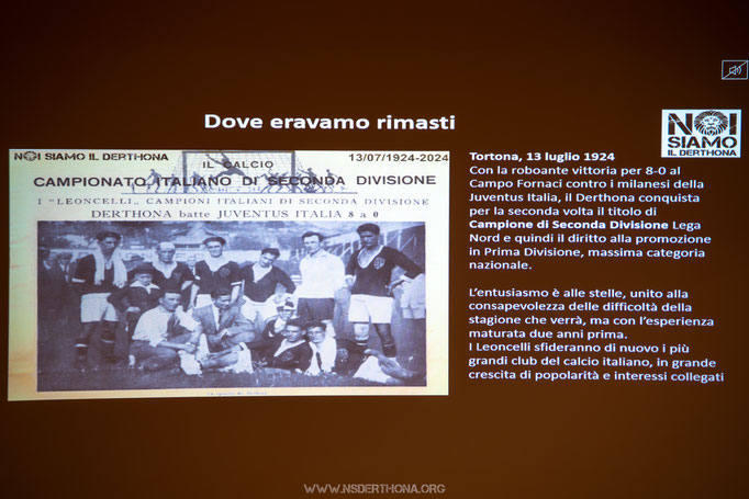 L'evento è stato presentato da Domenico Cremonte, giornalista di Radiopnr Diocesi Tortona e fine conoscitore di calcio di ogni tempo e latitudine, e dal nostro Presidente Andrea Freddo con una ricerca sull'ultima stagione che il Derthona si trovò a disputare nella massima categoria nazionale dell'epoca, la Prima Divisione.