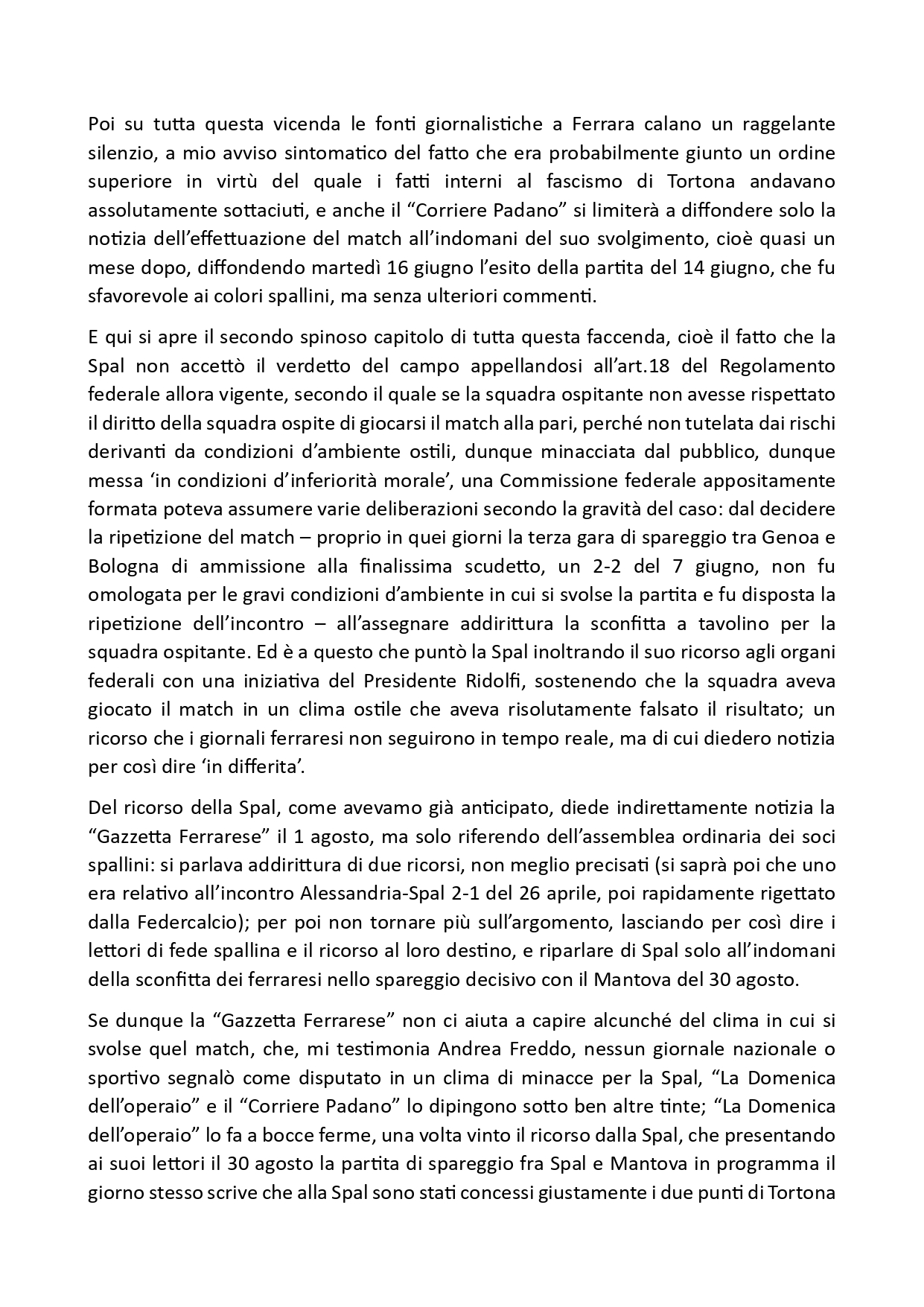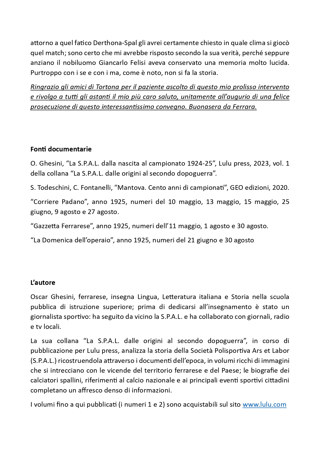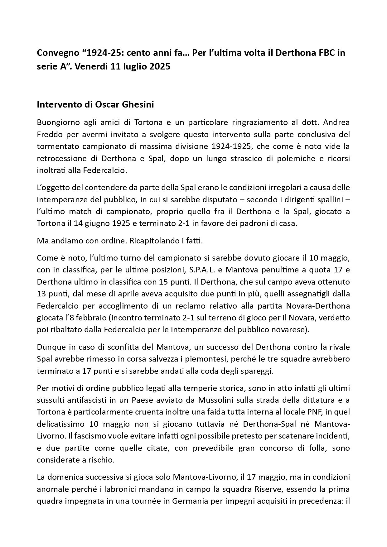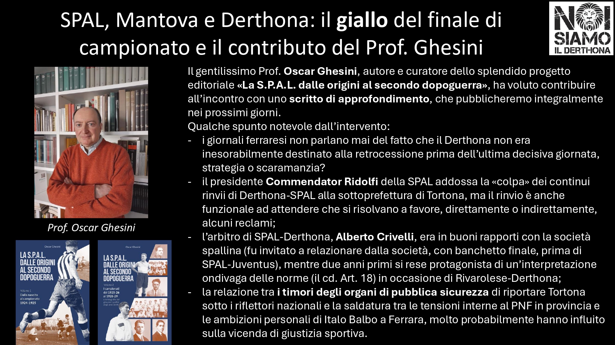 Intervento del Prof.Oscar Ghesini, sulla parte conclusiva del campionato, conclusasi con la retrocessione di Derthona e SPAL